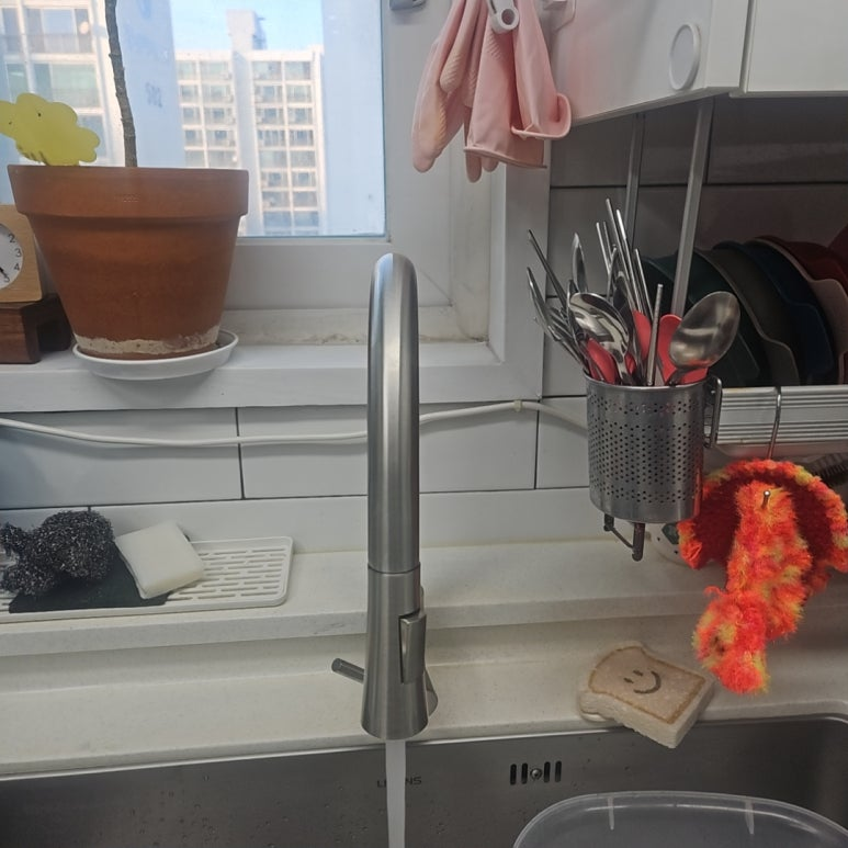 수전 높이가 좀 있기 때문에 큰 냄비나 프라이팬 세척이 편하고,
